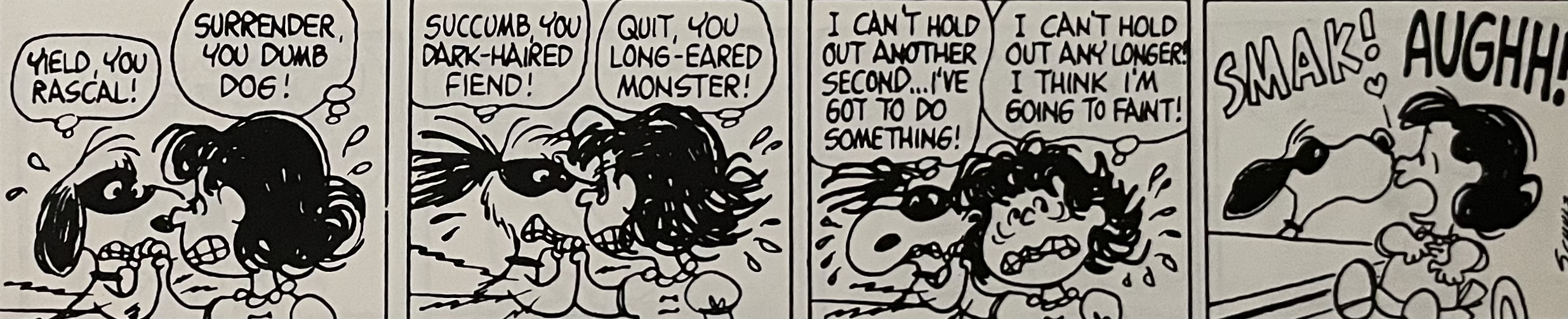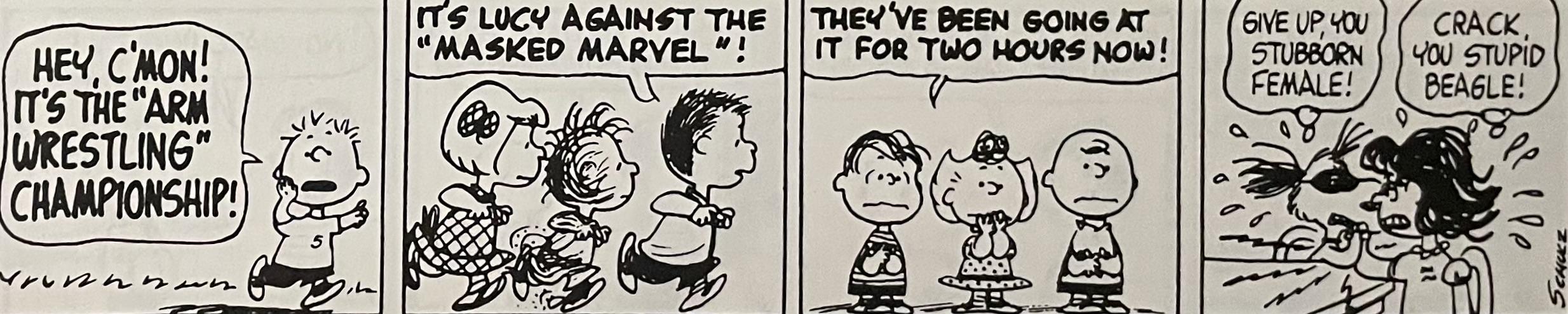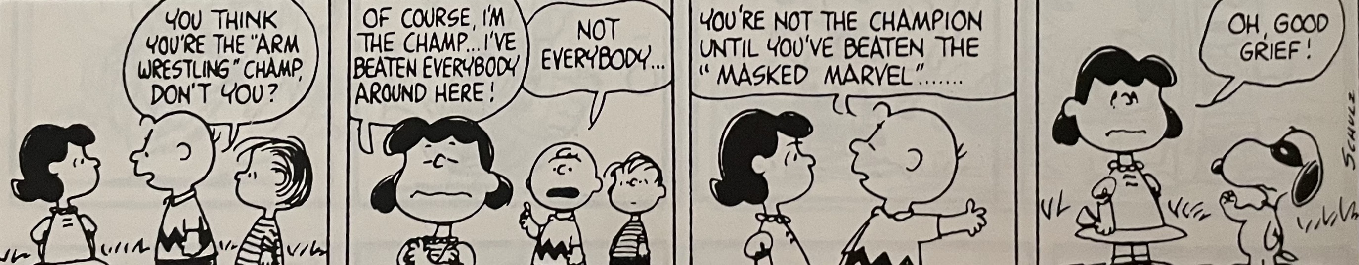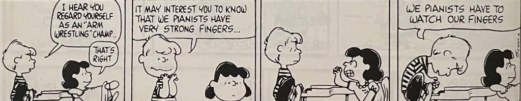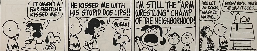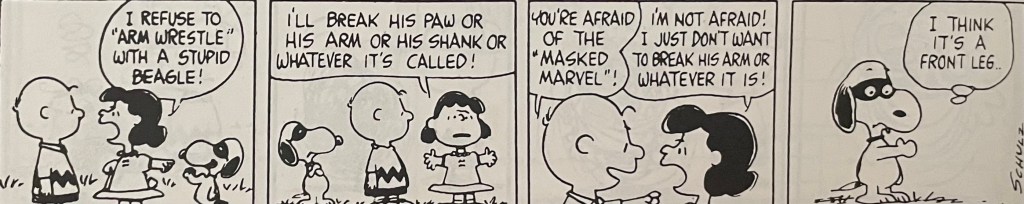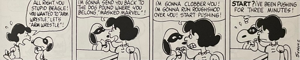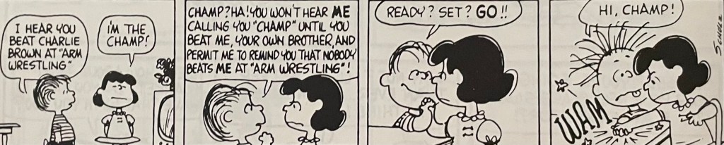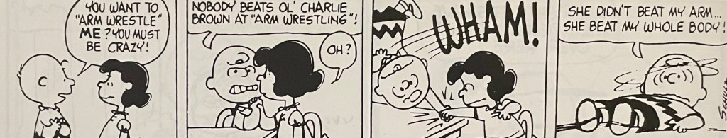 This comic strip sequence is one of my favorites out of the many that ran during Charles Schulz’s tenure on Peanuts. I didn’t have to follow this particular arm wrestling sequence day by day when these strips came out in the 1960s(?). I had a giant Peanuts treasury edition so that I could read everything in this sequence at the same time. I still have the book. I think I received it as either a birthday or Christmas gift. For today’s blog, I’ll just say it was a birthday gift, probably in 1973 or 1974, so thank you to whoever gave me this book! I hope I wrote you a decent thank you letter.