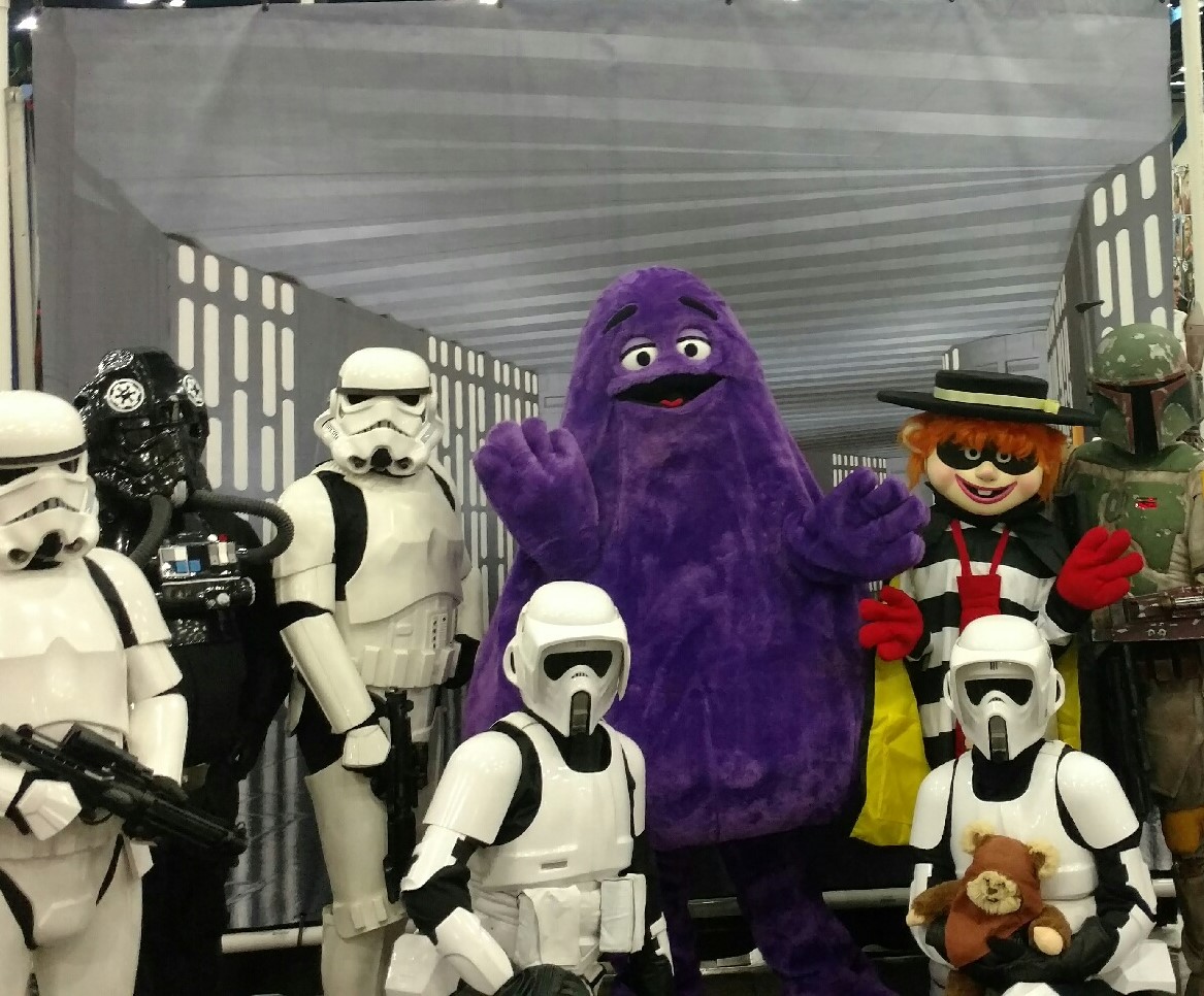 Everybody was getting along.  Marvel and DC cosplayers were taking selfies together.  The weirdest mix was a group of imperial stormtroopers posing with the McDonalds Hamburglar and Grimace (the goofy purple monster).  The comic book convention is the only place where different genres of cosplay can get along.  If they’d met in Times Square, there would have been a brawl.