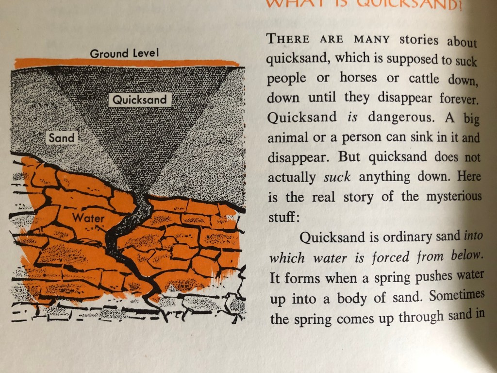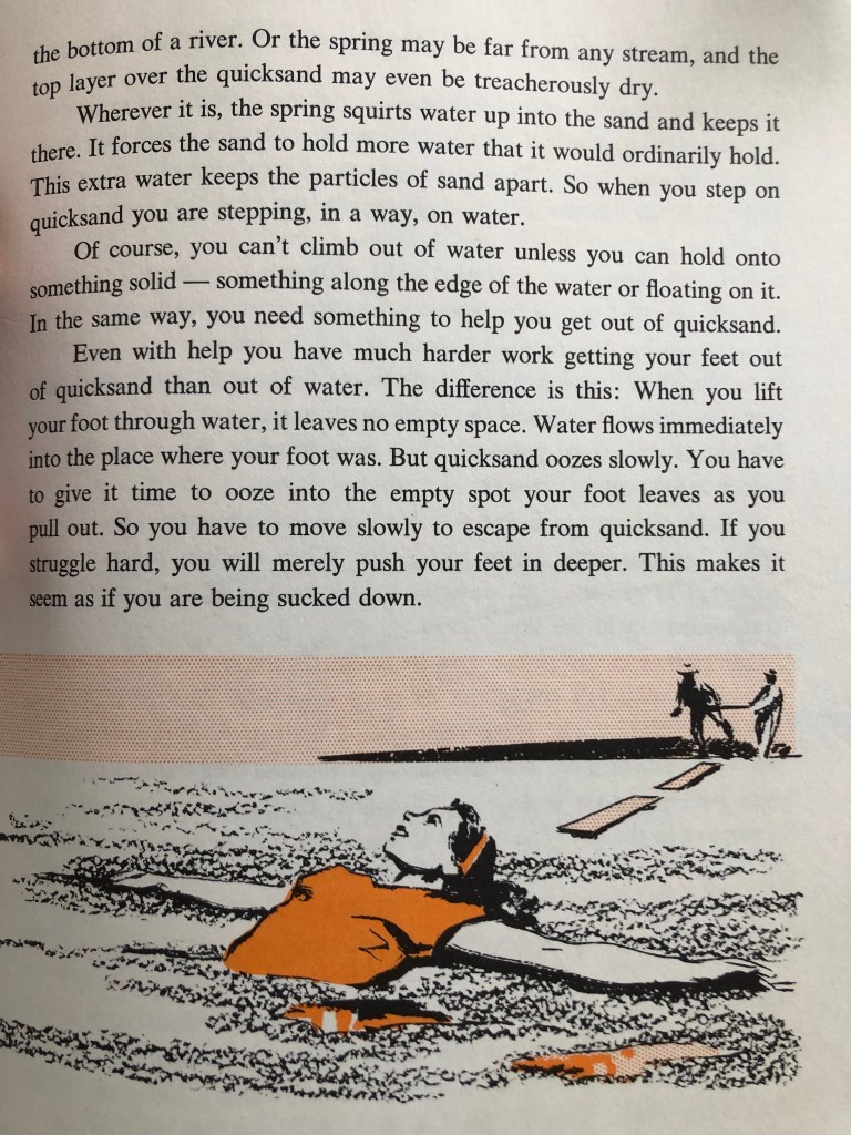 I don’t know who to believe, the book from the 1970s or the internet of today. The book said it can happen; it doesn’t say that it actually has happened. That’s a sneaky word trick to play on a kid. I don’t blame movies for trying to scare kids with quicksand. Movies are supposed to scare people. But a science book should know better.