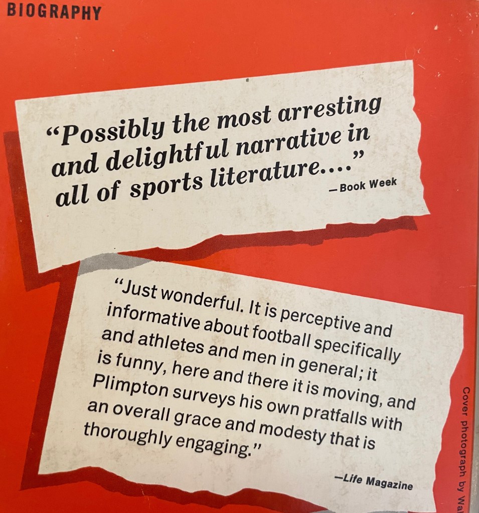 Paper Lion received some pretty good book reviews at the time, and you can see them prominently displayed on the paperback back cover. If you think the front cover is kind of bland, the back cover makes up for it with bright red surrounding several extremely positive reviews. I think some of these reviews overdo it a bit, but the author of Paper Lion was a sports writer, and journalists, including critics working for the newspapers, have to look out for each other.
