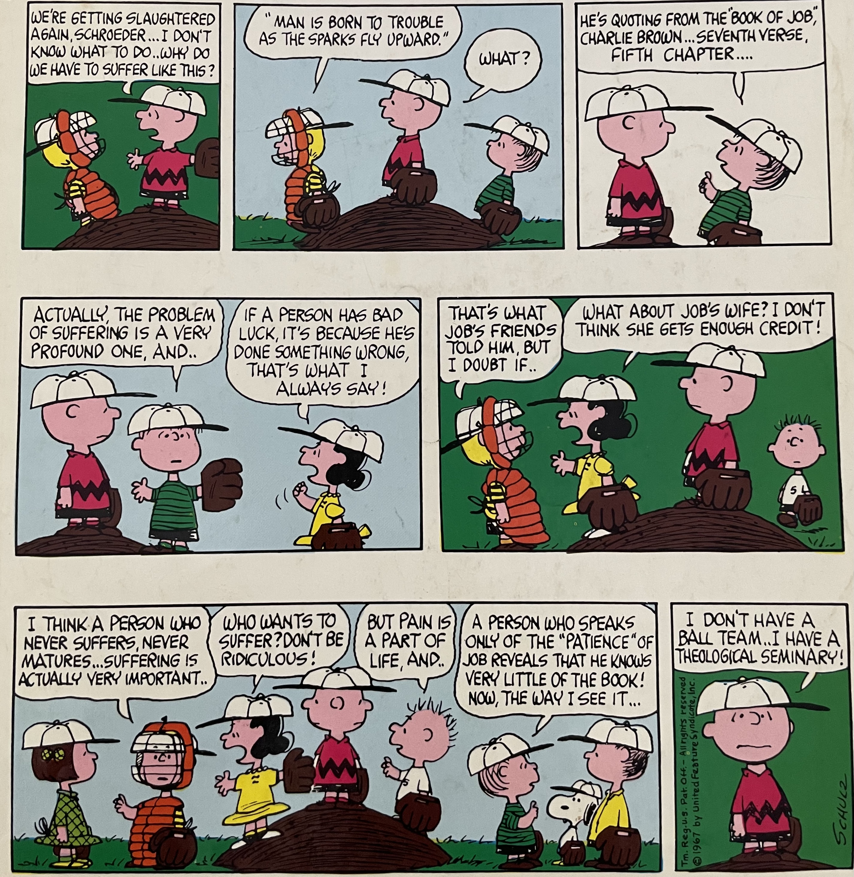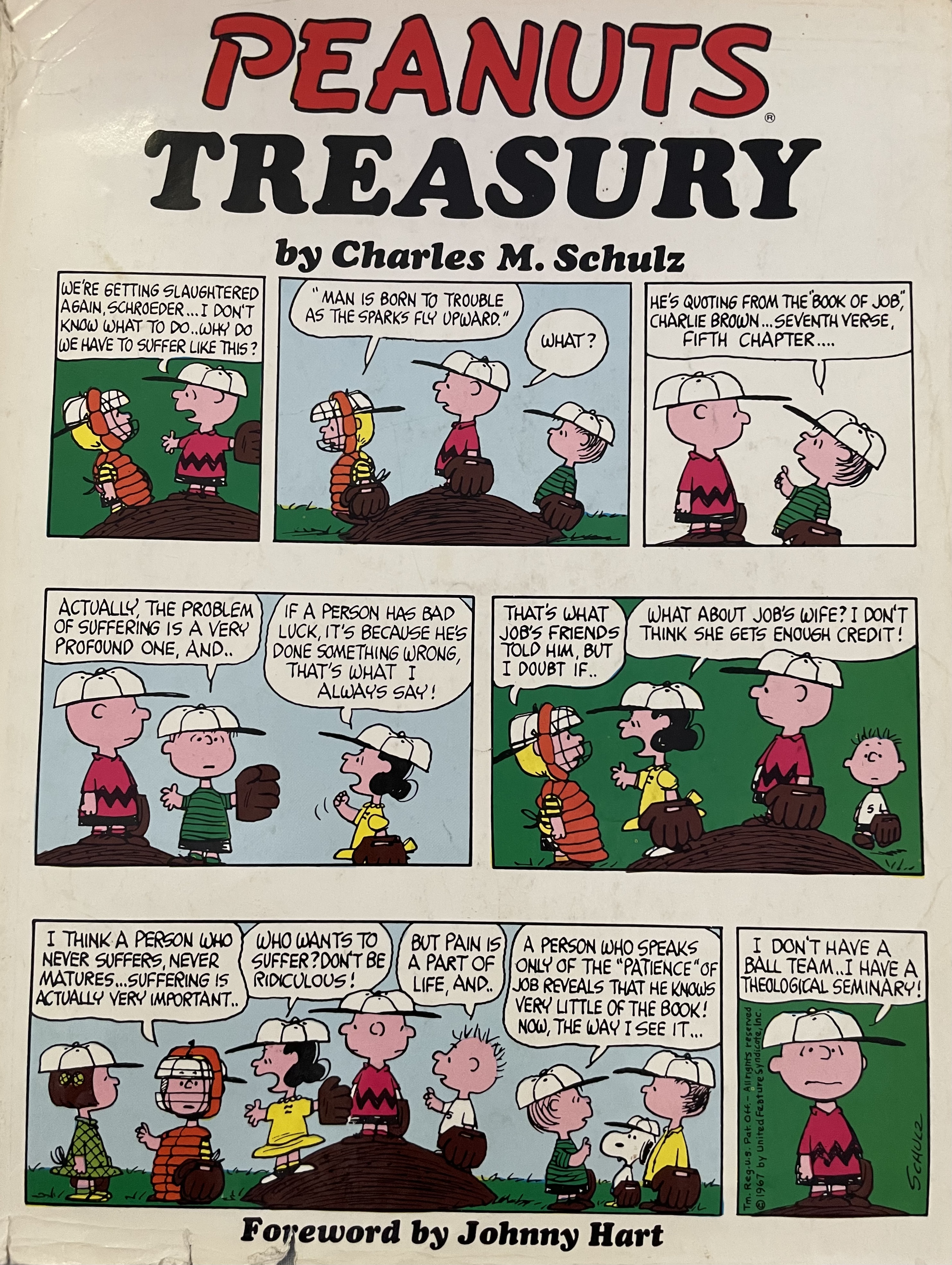 The cover of the book that has my favorite Peanuts strip reminds me of a scene from the movie Bull Durham, which came out in the late 1980s. From what I understand, conversations like this on a pitcher’s mound aren’t that uncommon, so I’m not going to accuse the scriptwriters of stealing from Charles Schulz.