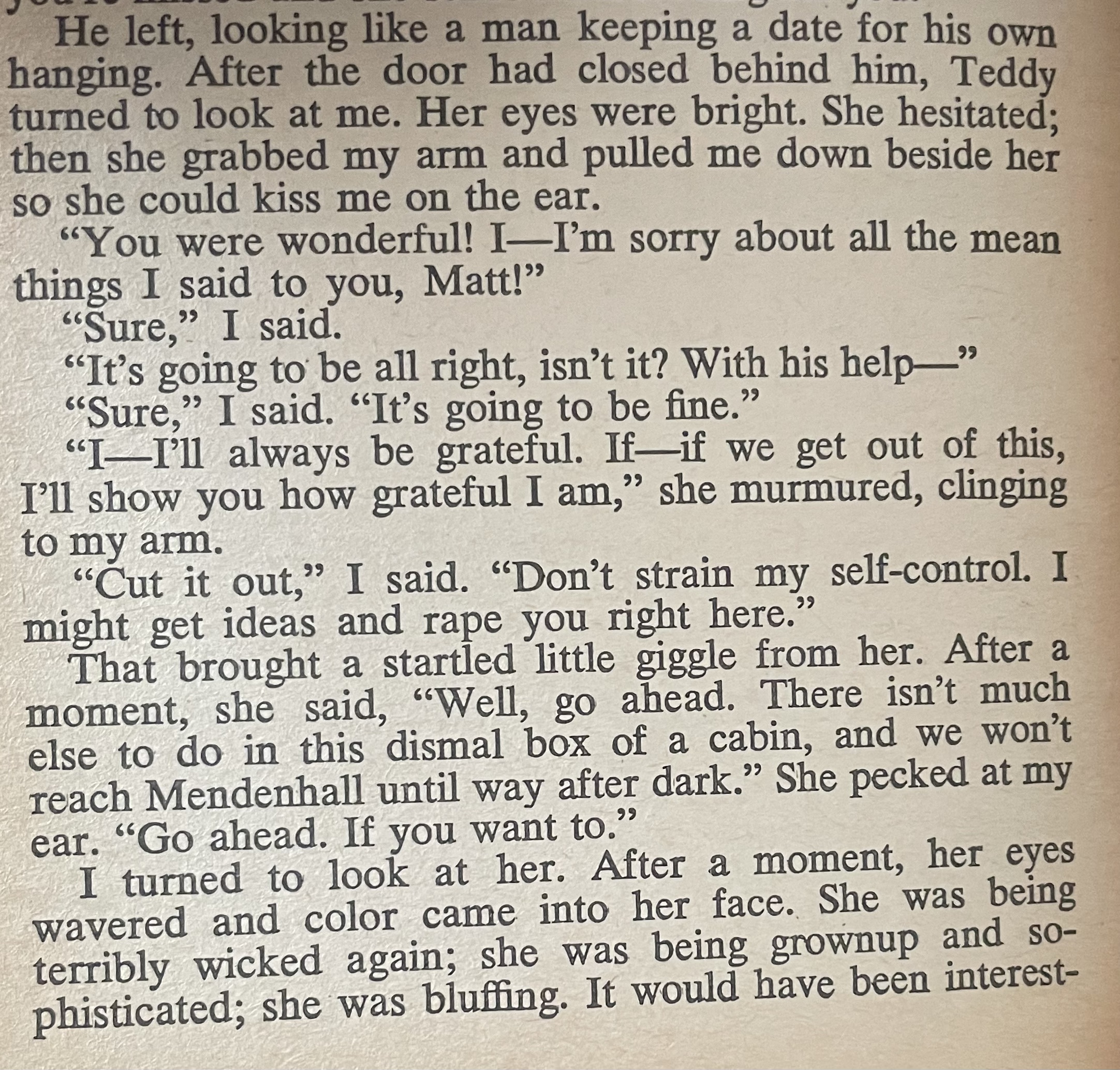 “Cut it out,” I said. “Don’t strain my self-control. I might get ideas and rape you right now.”