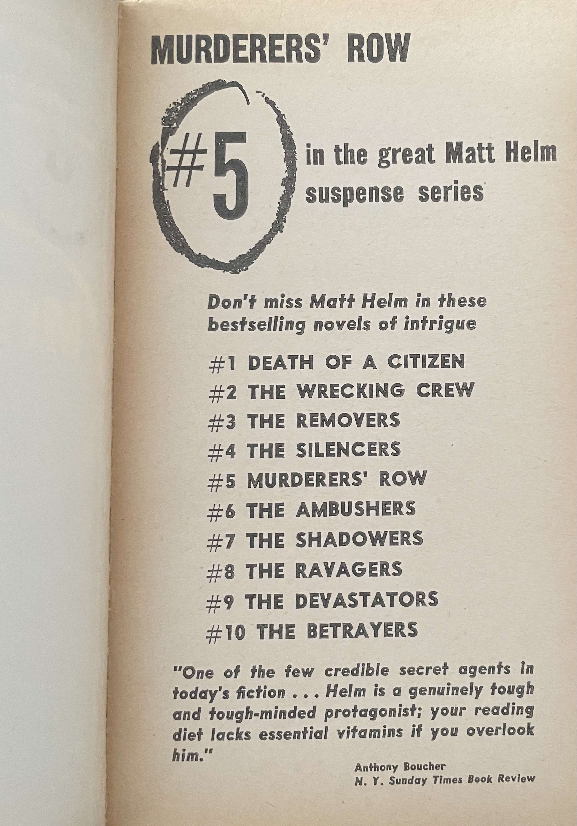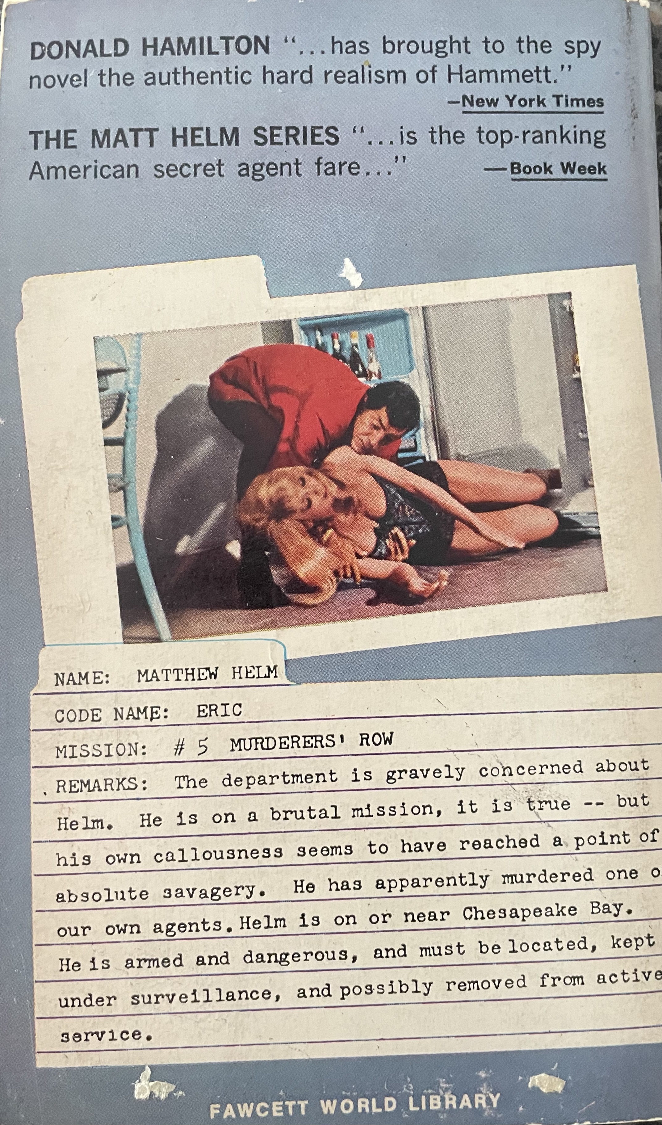 When I began reading Murderers’ Row by Donald Hamilton, I wasn’t expecting the highest quality espionage literature of the 1960s. In fact, I was pretty sure that I was in for some low quality writing. But I wasn’t expecting a rape joke.