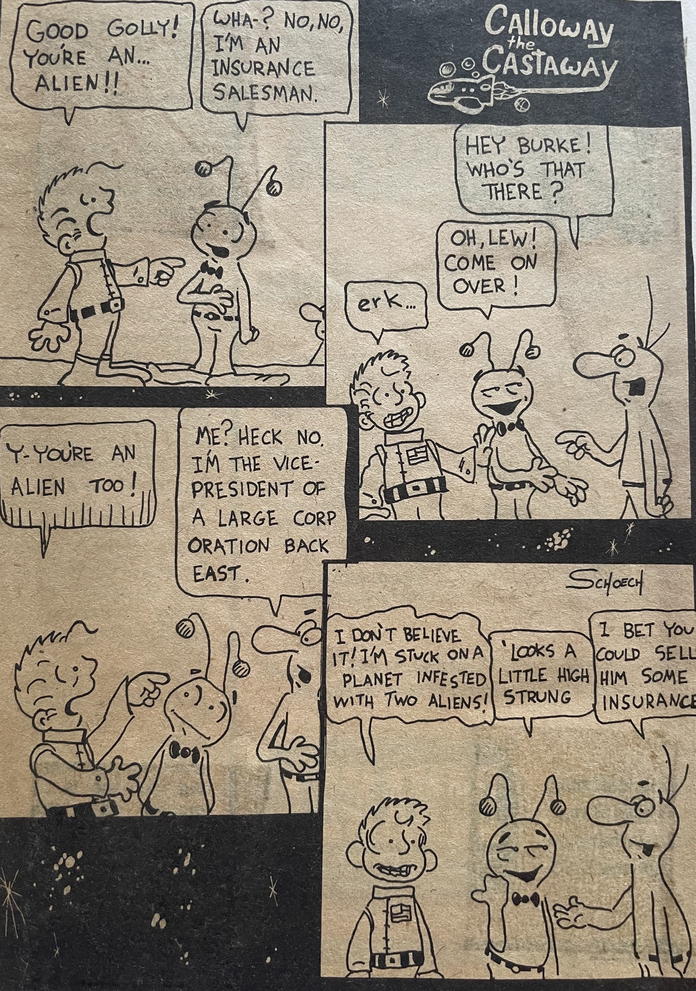 When my older brother found the original artwork from his 1979 comic strip “Calloway the Castaway,” a few of the originals were missing. Fortunately, my brother had clipped out his comic strips from the local weekly newspaper back then and made a mini-scrapbook of them, which he also boxed with the originals. Without this scrapbook, we would be missing key episodes in his short comic strip run.