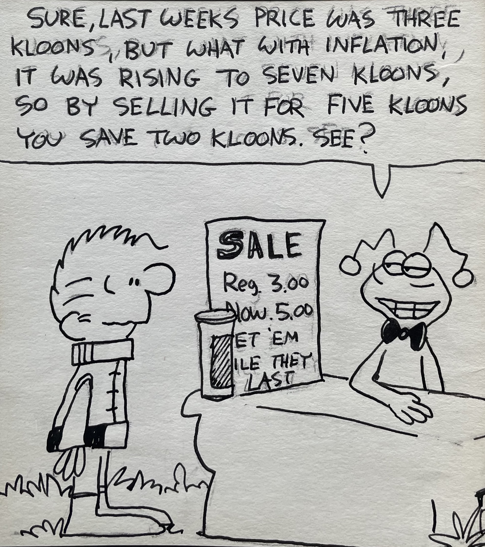 When my older brother’s comic strip “Calloway the Castaway” came out in 1979, inflation was a major financial issue in the United States, maybe even more so than it is now. I’m not sure how I feel about inflation also being an issue on other planets. I guess some human problems are universal.