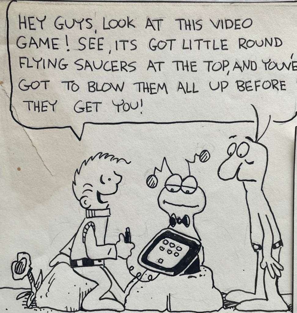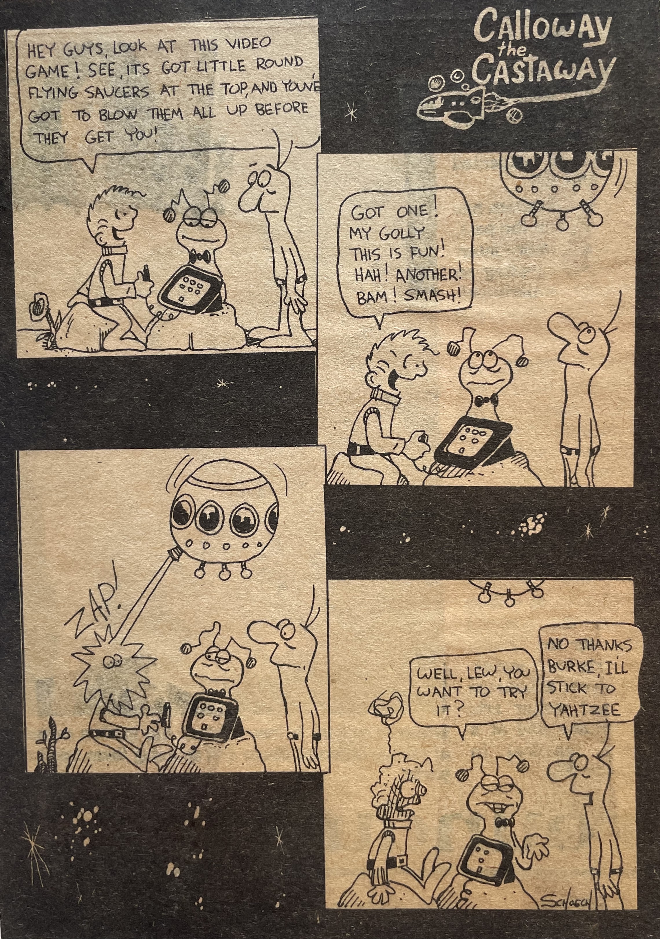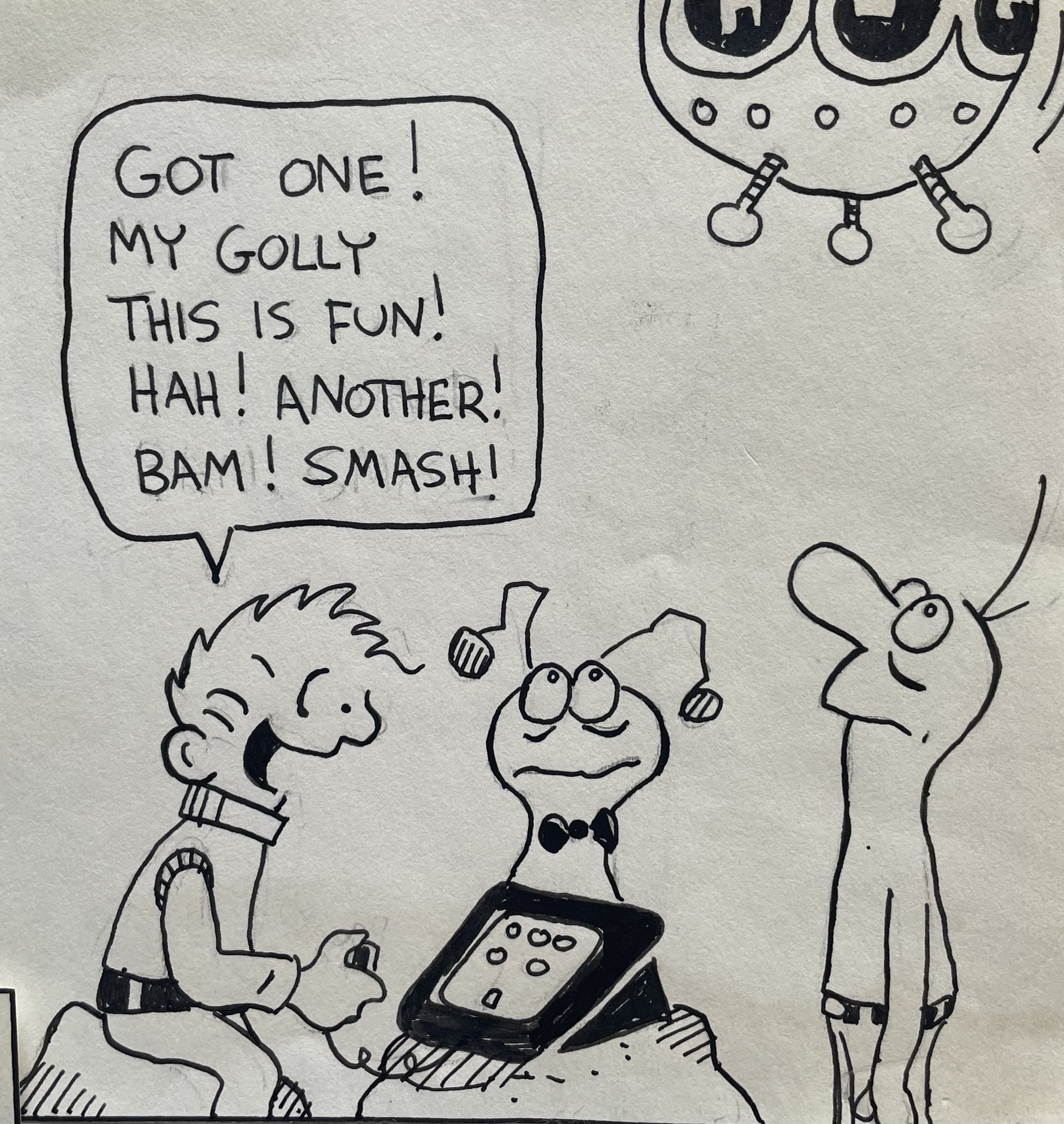 If the arcade game in the comic strip below looks archaic, that’s because video games looked like that in 1979 when my older brother’s comic strip came out in our local weekly newspaper. Those of you who were around back then, you probably remember some of those games.