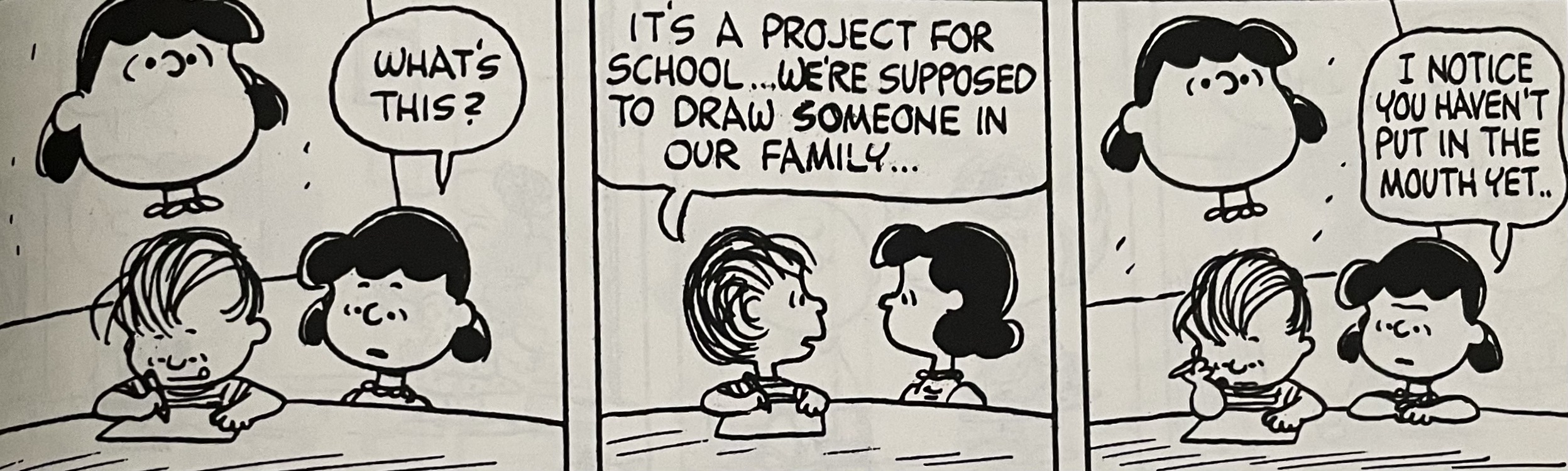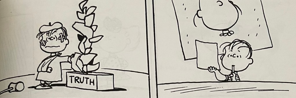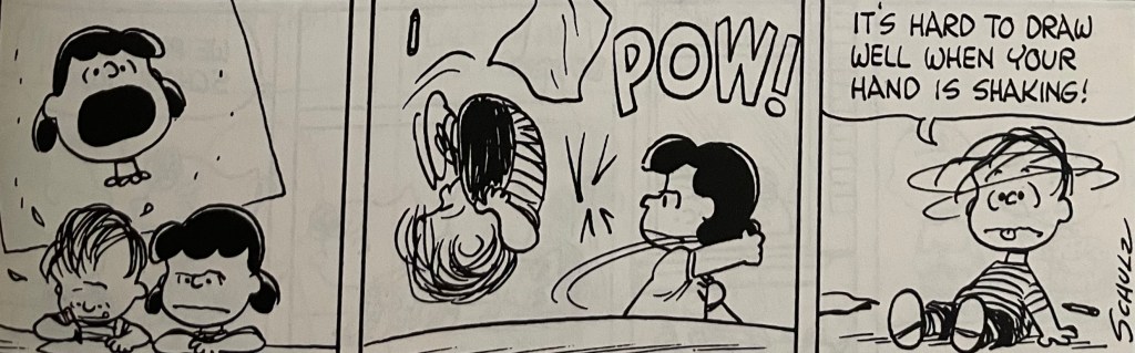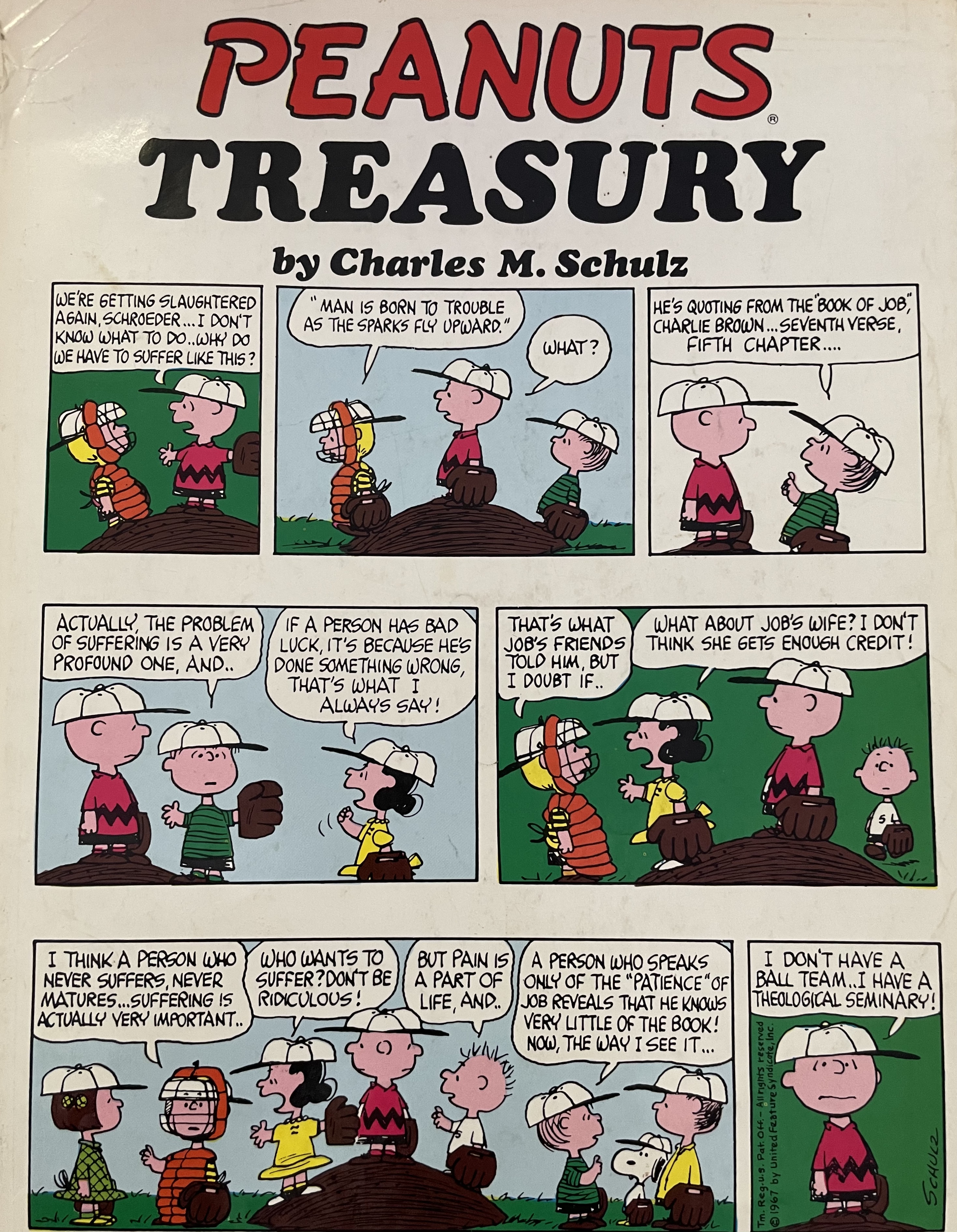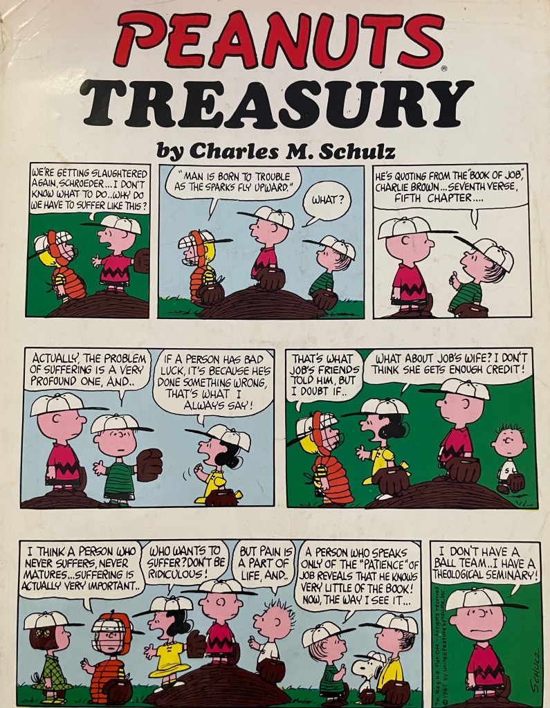 Charles Schulz and I share the same birthday, November 26, and for years I’ve been meaning to share my favorite Peanuts comic strip on Dysfunctional Literacy, but I keep forgetting. Today, I remembered and posted it below in four parts. The Peanuts Treasury (cover posted above) has a bunch of classic Peanuts strips from the 1960s (I think) and 1970s.