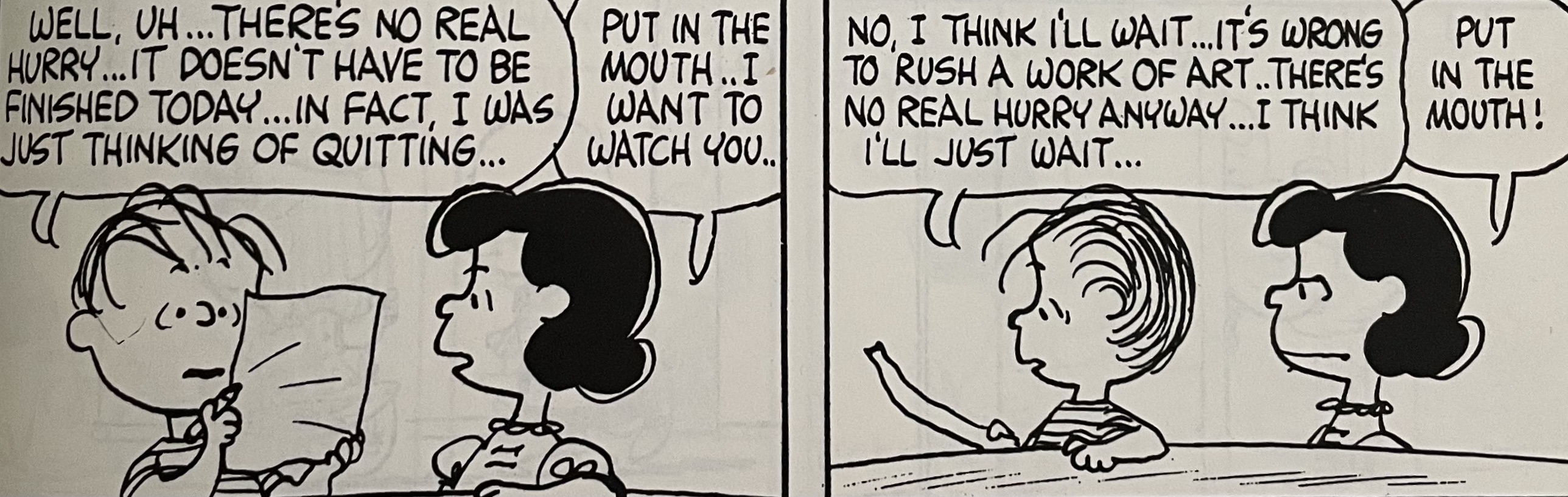 Haha! I related to this strip a lot when I was a kid. Anyway, Charles Schulz was an introvert (I think). He might have approved of the five-minute birthday party.