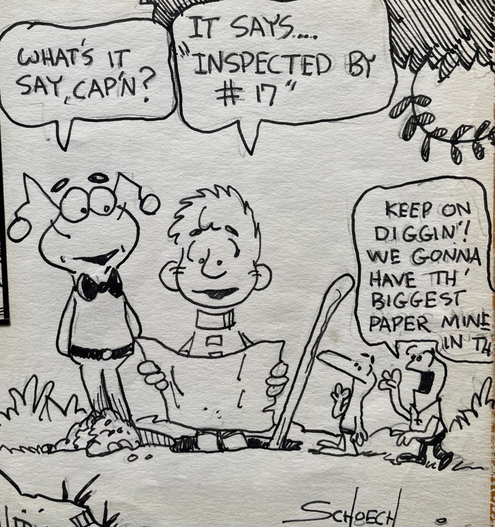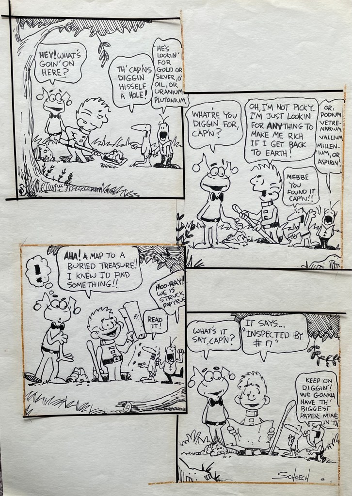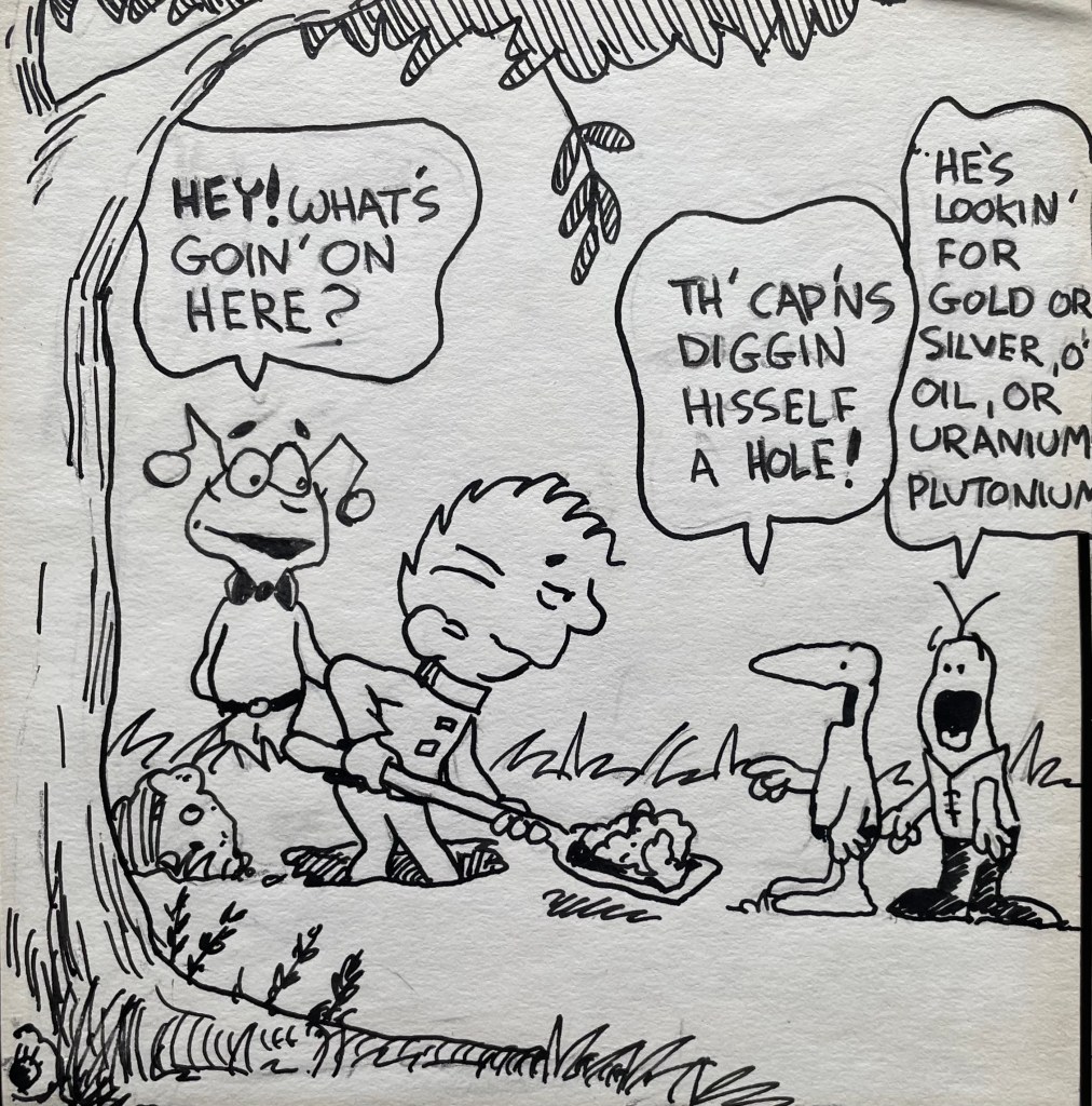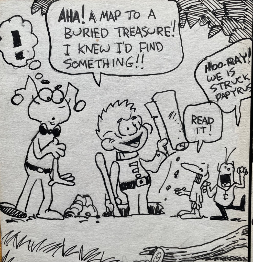 Some readers might think that the comic strip “Calloway the Castaway” starts getting weird here. My older brother was a fan of the comic strip “Pogo” by Walt Kelly, and in the next few episodes, he starts to borrow Kelly’s style a little bit. The emphasis in the comic strip is the storyline rather than the punchline, and there will be more stuff going on in the panels.