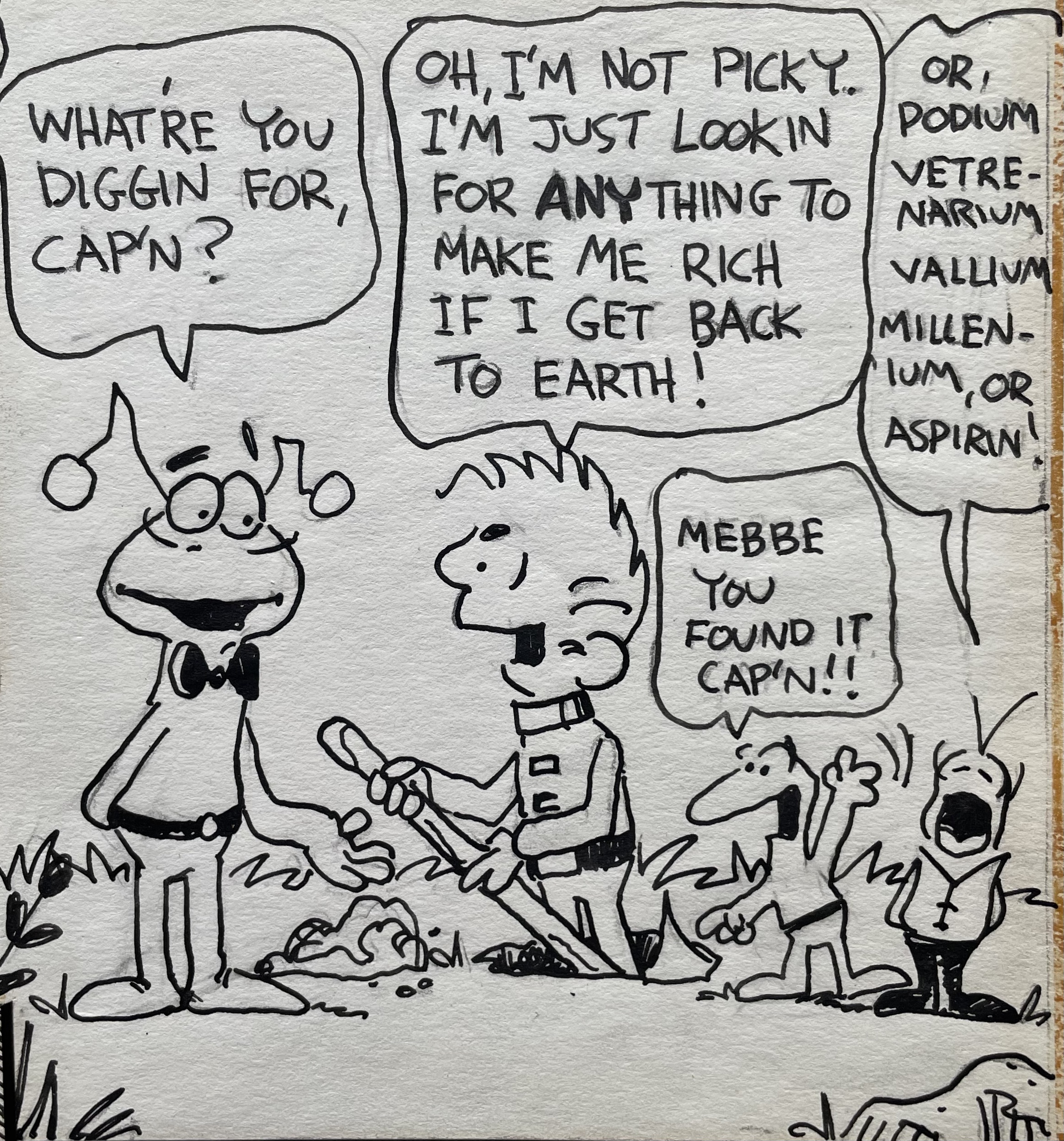 Some readers might think that the comic strip “Calloway the Castaway” starts getting weird here. My older brother was a fan of the comic strip “Pogo” by Walt Kelly, and in the next few episodes, he starts to borrow Kelly’s style a little bit. The emphasis in the comic strip is the storyline rather than the punchline, and there will be more stuff going on in the panels.