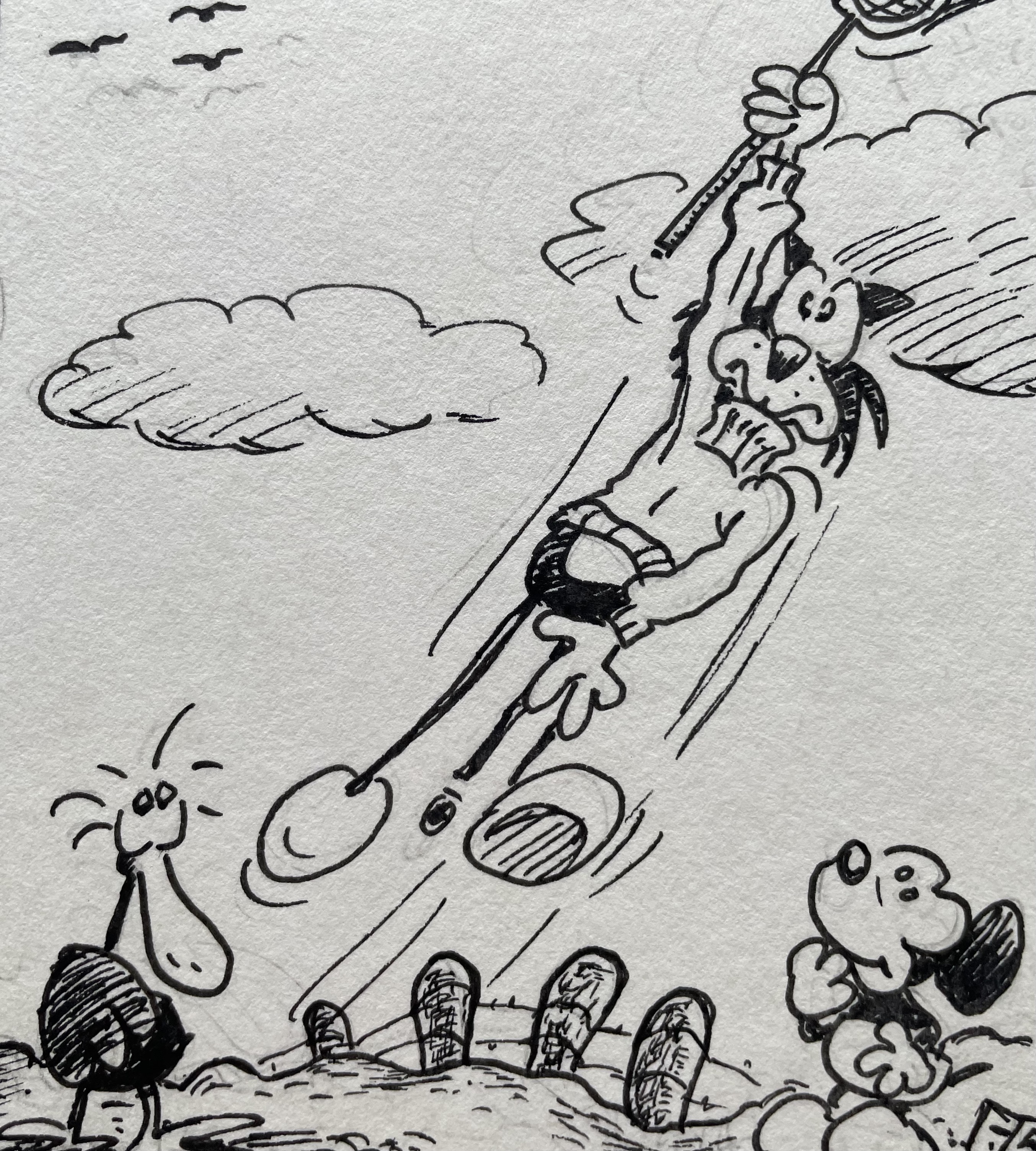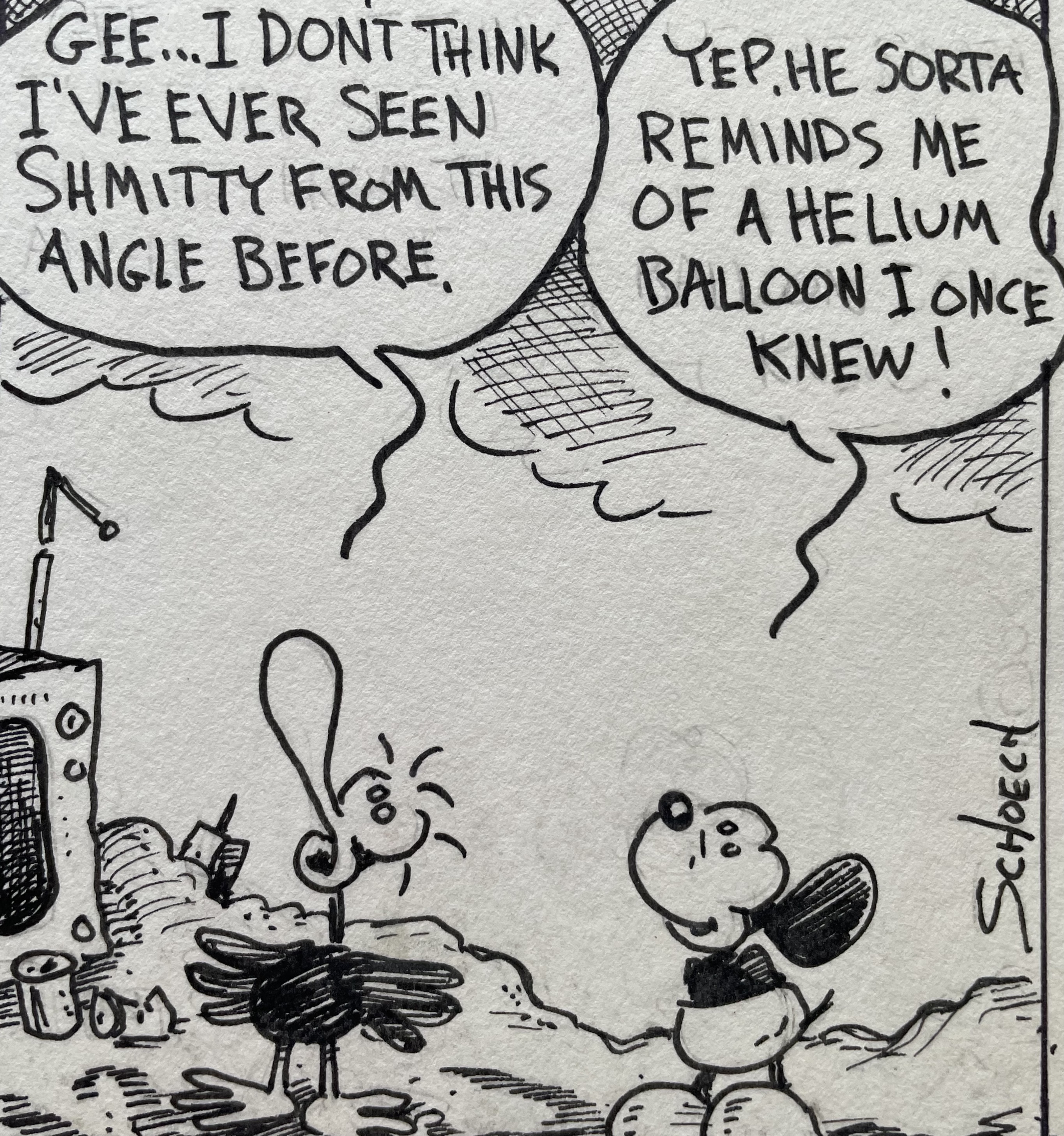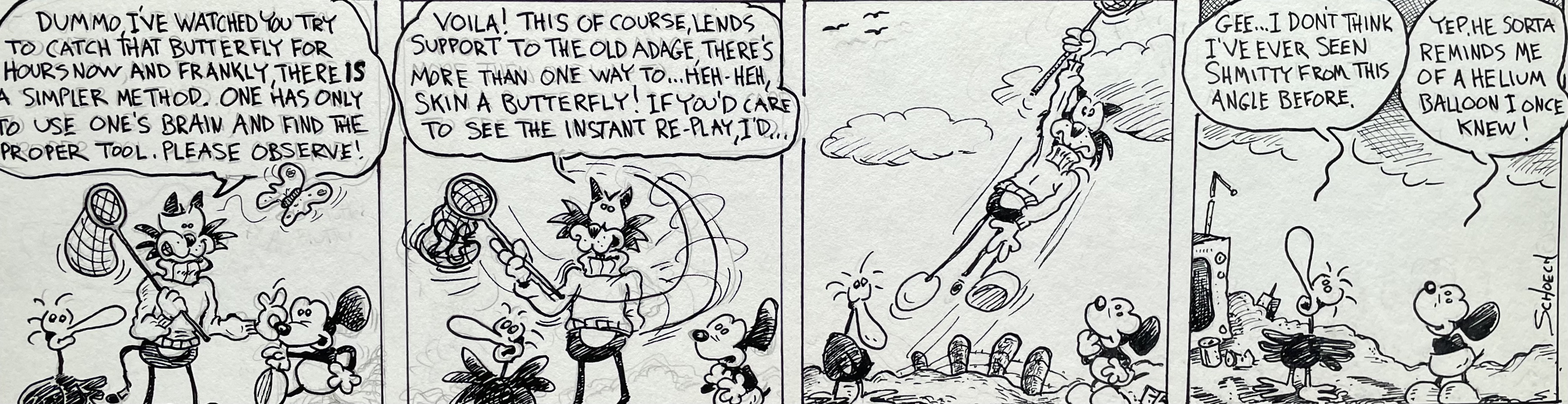 At first, it looked like my older brother’s Dummo Mouse comic strip from 1982 would be a typical cat vs. mouse comic strip, this time set in a junkyard. A few early comic strips like today’s might make it seem that way, but this one can be misleading. As we’ll see over the next few weeks, a cartoonist has to set things up before going all-out.