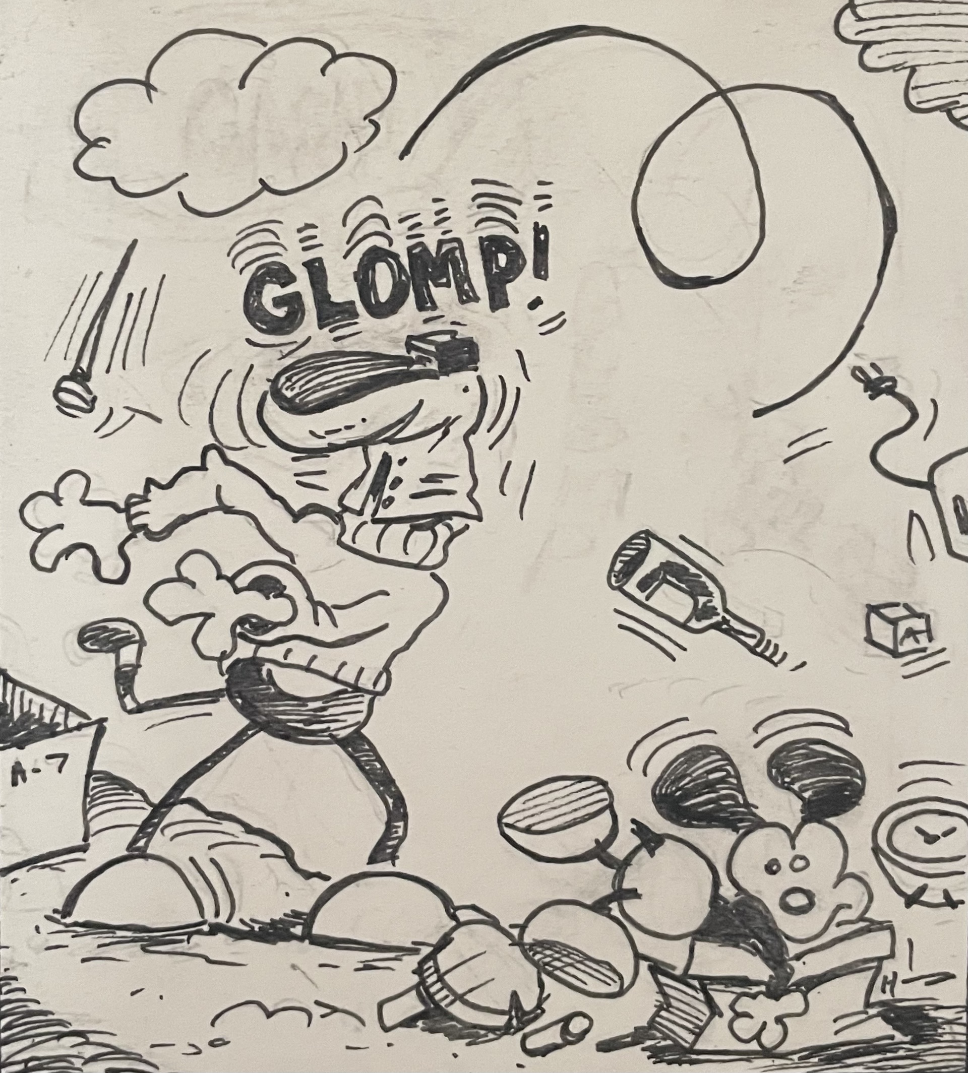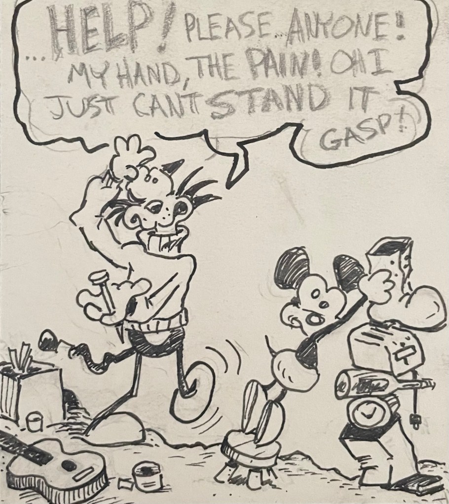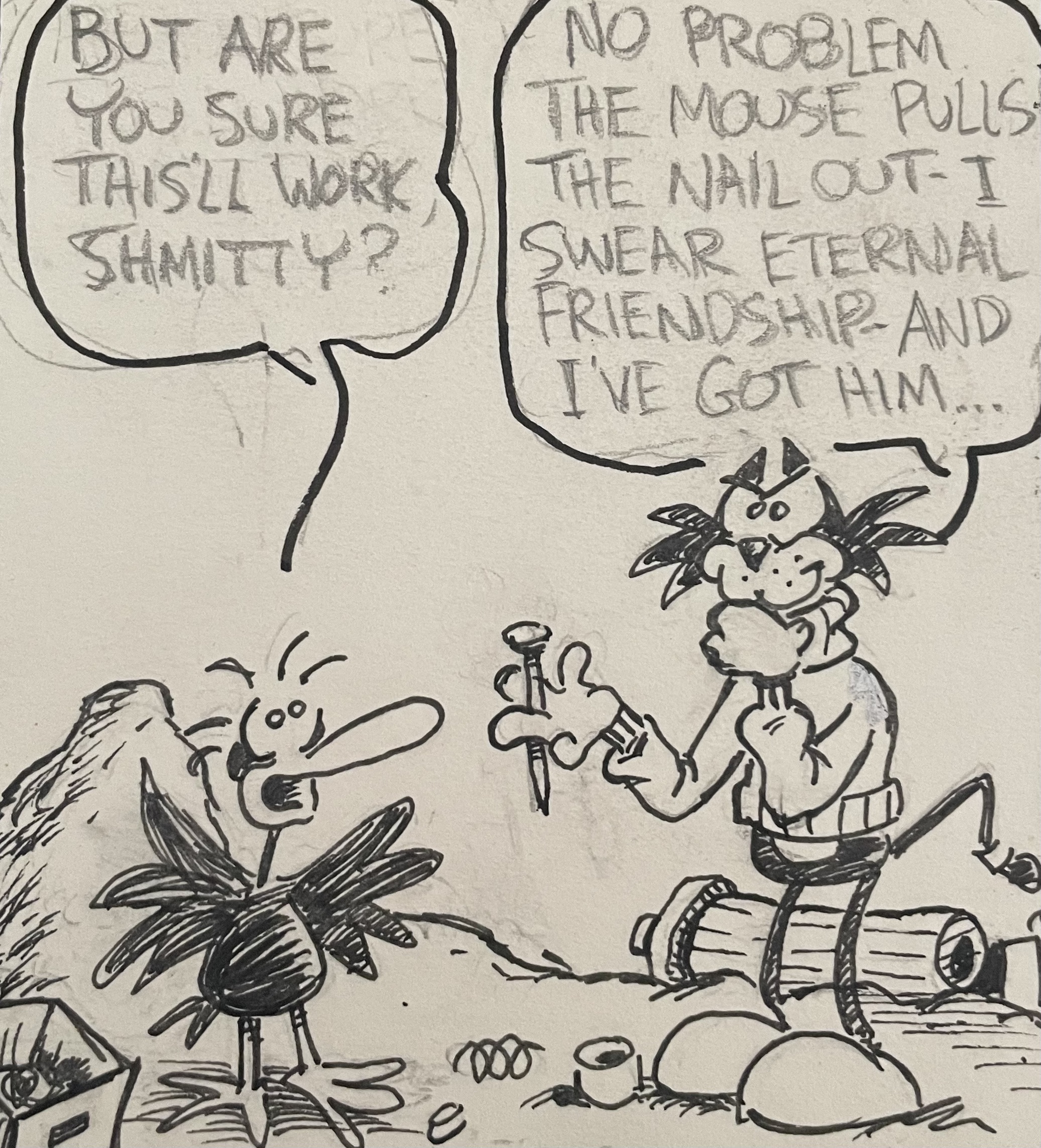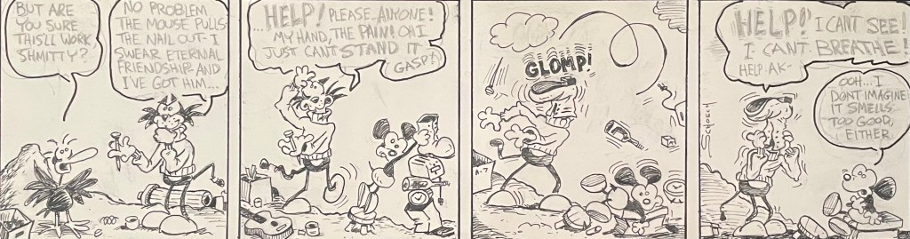 Please excuse this contrast between ink and regular pencil in today’s comic strip. From what I can find from old boxes, it seems like my older brother never got around to inking the rest of these never-before-seen Dummo Mouse episodes from the early 1980s. In fact, the rest of the comic strips are in pencil only, so next week we’ll see how pencil by itself looks on a blog post. Until then…