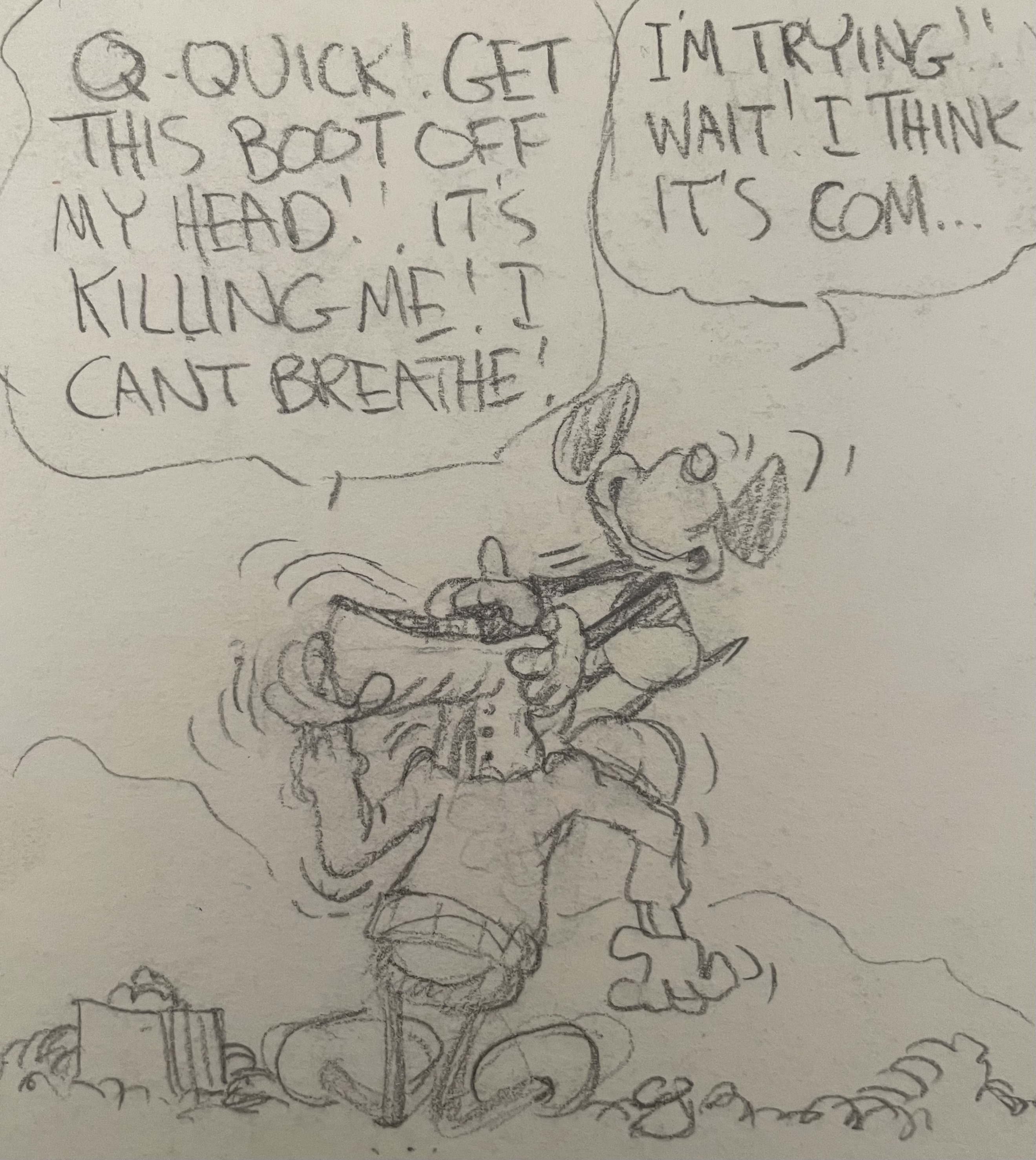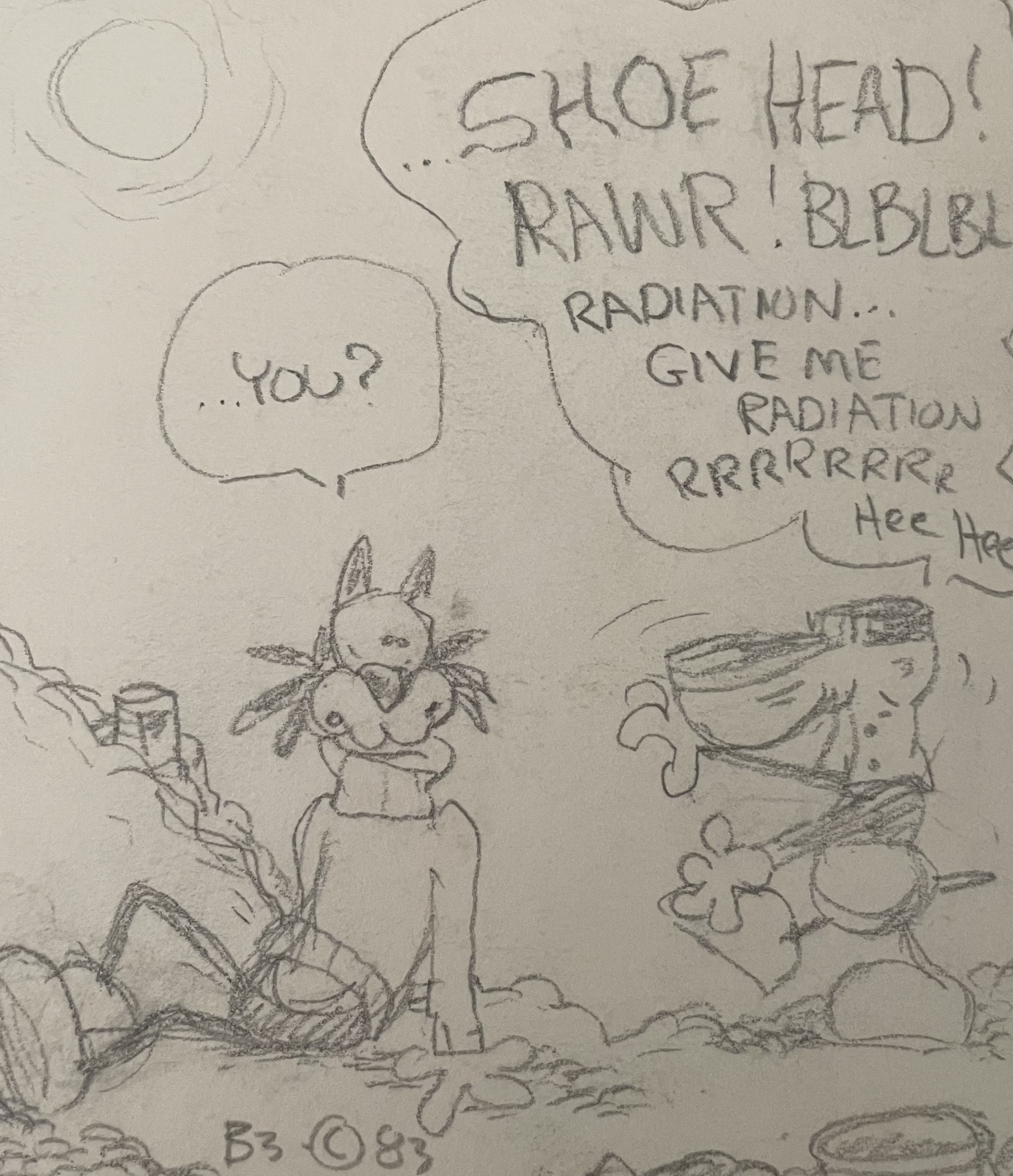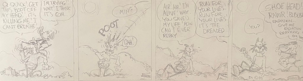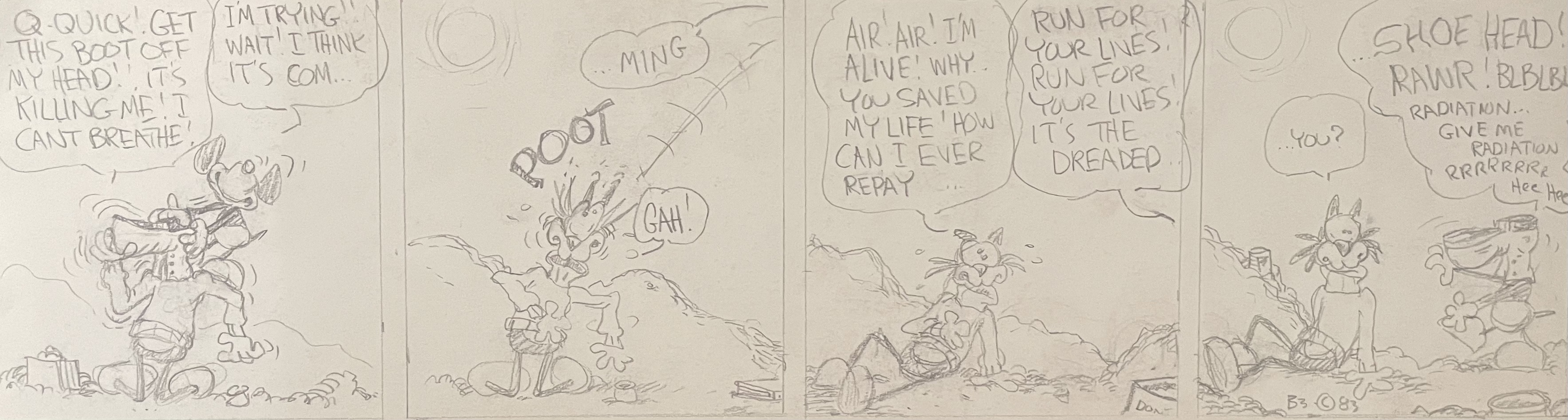 Most of my older brother’s remaining Dummo Mouse strips from 1983 made it only to the pencil stage, so this week’s strip is an experiment to see how pencils-only translate to a blog. If it’s too light for you to see, then… I don’t know. I see these panels just fine, but I’m on a desk top right now. If you’re on a laptop or a phone, it might be different.