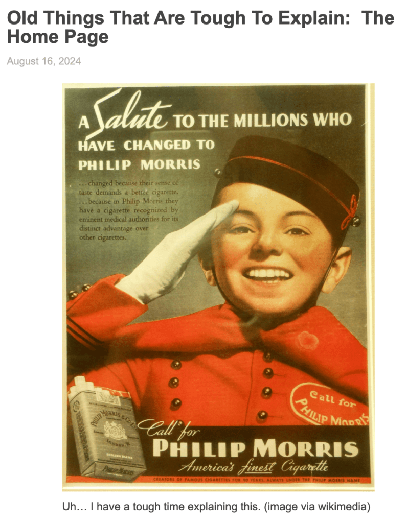 Some people my age get nostalgic about the past, but there’s a lot of stuff that I’m glad has changed.  Whenever I get anti-nostalgic, which really doesn’t happen very often, I write one of my Old Things That Are Tough To Explain articles.  Here’s where you can find most of them.