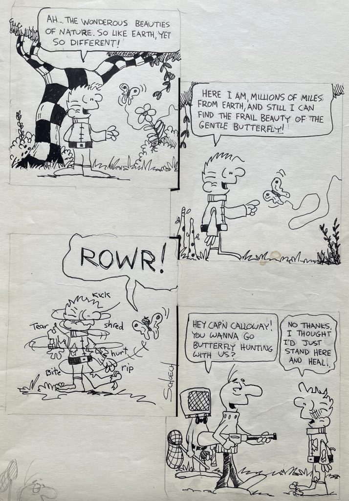 About ten years ago, my older brother found the original drawings of a bunch of comic strips that he had published in our local small town newspaper in the early 1980s. His dream at the time was to be a syndicated comic strip creator, but stuff like that is a long shot for people like us with little money and no connections. Once my brother got married and started raising his kids, other things became more important to him (we all know the story).